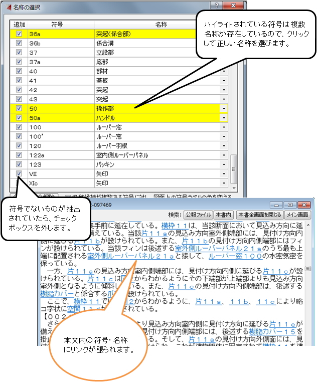 図面上に、本文から抽出した名称を表示させ、相互リンクさせることで、
